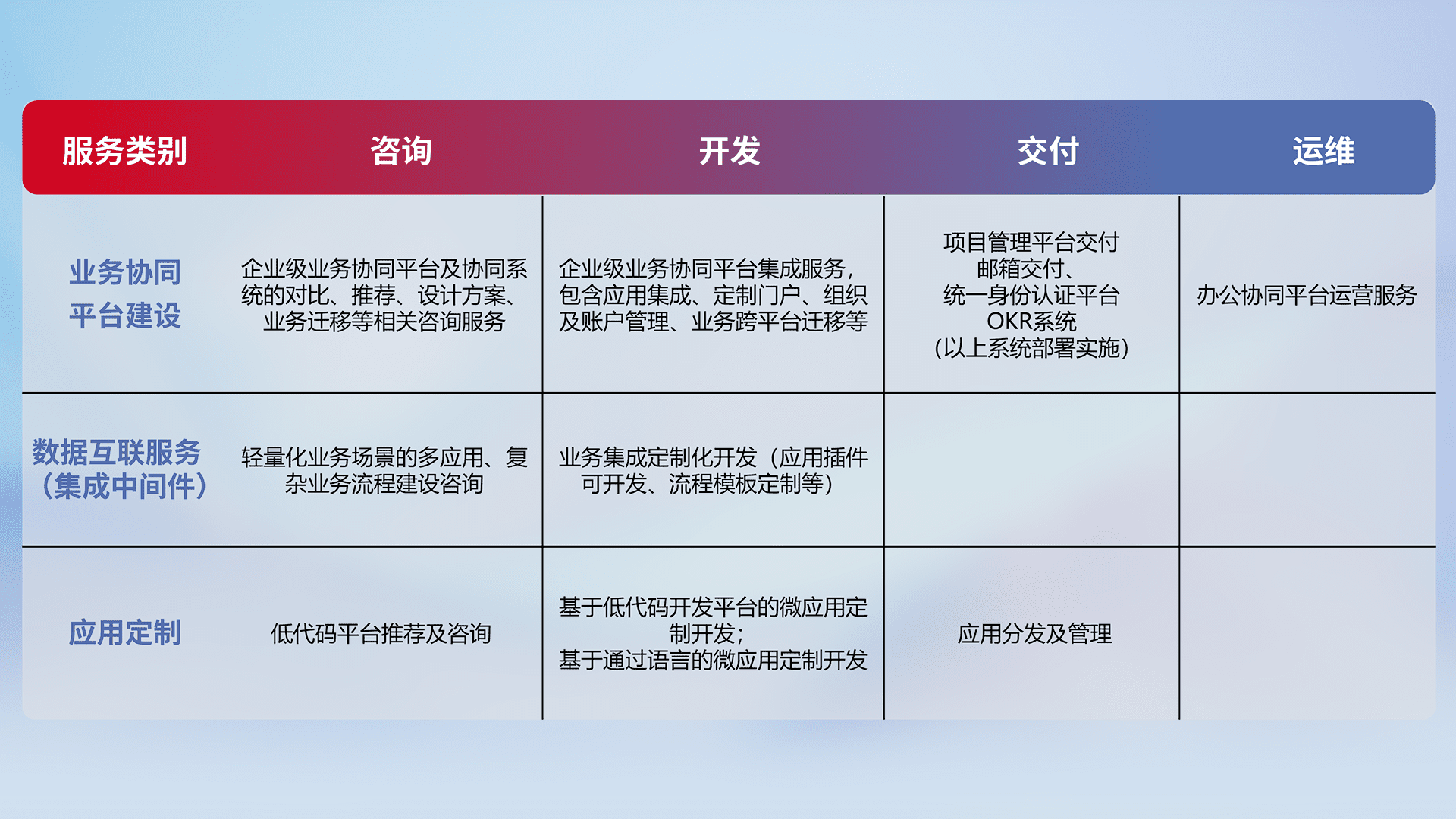 针对钉钉、、、、企微、、IDaas等平台级产品提供产品的规划、、、、方案、、交付、、、定制化开发等服务,,,实现如统一协同办公、、、、智能客户服务、、、、混合会议管理、、智能数据查询、、、等业务场景,,,,实现数字化转型。。。。